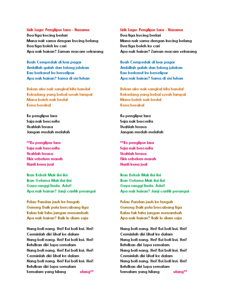 Lirik Lagu Penglipur Lara Hazama Dua tiga kucing berlari Mana nak sama dengan kucing belang Dua tiga boleh ku cari Apa nak hairan. Request Chord Services Organizes Chords Collection. Wahai penglipur wahai lara.